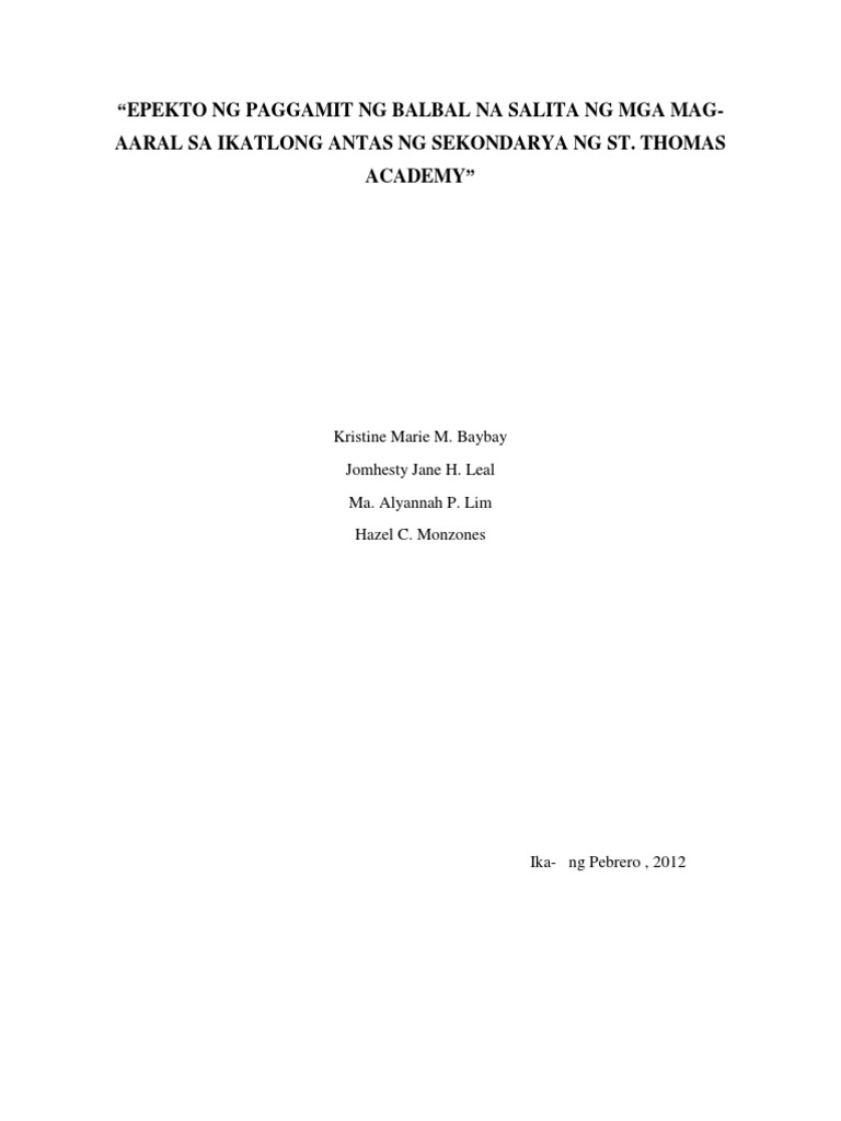 Thomas Academy sa taong panuruan 2011-2012 tungkol sa epekto ng pagkasanay sa paggamit ng salitang balbal sa mga kabataan ngayon. Layunin rin ng pag-aaral na ito ay ipalawak ang kaalaman ng mambabasa ukol sa mga pagkakaiba ng mga mali at tama na paggamit pagwawasto at interpretasyon ng ibat ibang tao sa wikang Filipino Ingles at mga salitang conyo. Eto ang tatak ng pagka-Pinoy natin.