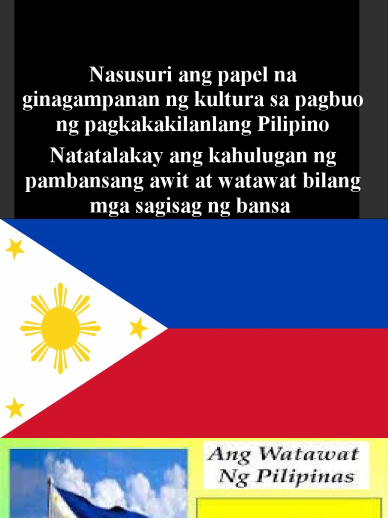Ang tatlong bituin ay sumisimbulo sa tatlong pangunahing rehiyon sa ating bansa. Ang Pambansang Watawat ng Pilipinas na tinatawag din na Tatlong Bituin at Isang Araw ay isang pahalang na watawat na may dalawang magkasingsukat na bahagi na bughaw at pula at may puting pantay na tatsulok sa unahan. Simbolo ng Watawat ng Pilipinas --Araw na may walong silahis Kinakatawan nito ang unang walong probinsiya na unang nag-alsa laban sa mga Espanyol.