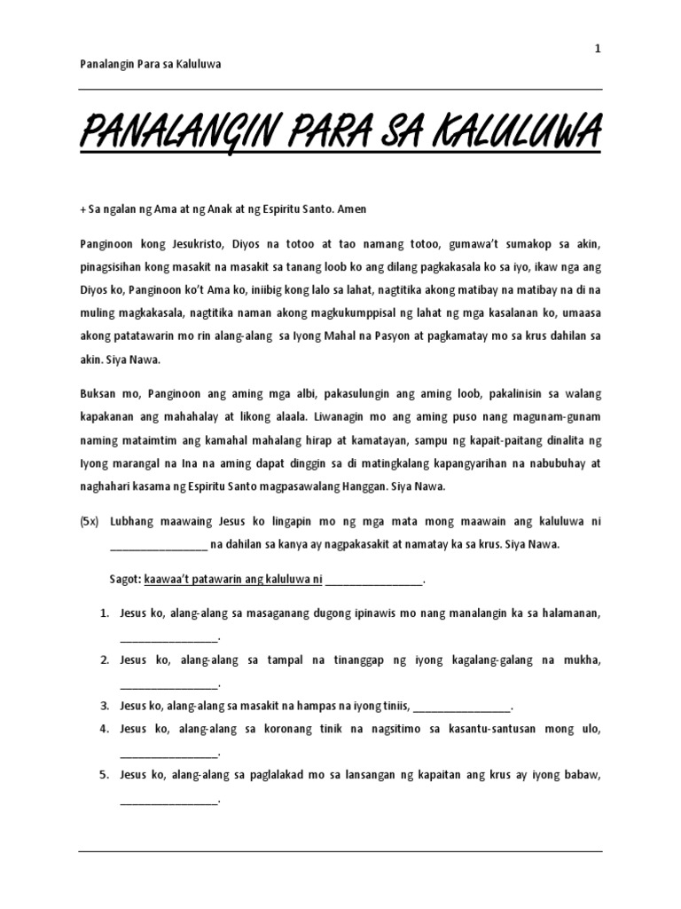 PANALANGIN Katamis tamisang Jesus ko sa pagsakop sa sangkatauhan ay inibig kong Ikaw ay ipanganak tumulo ang mahalagang dugo inalipusta ng mga Hudio napasakamay niyong mga tampalasan sa paghalik ni Hudas ginapos ng lubid dinala sa pagpaparipahan sa Iyo tulad sa Corderong walang sala iniharap kay Anas kay Pilato at kay. Prayers for the dead. PANALANGIN PARA SA MGA KALULUWA.