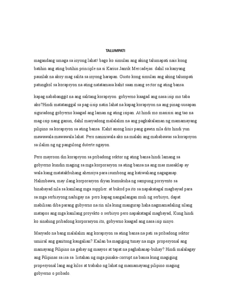 Isa sa mga naging aksyon ng gobyerno ay ang pagpapatupad. Talumpati Tungkol Sa Korapsyon.