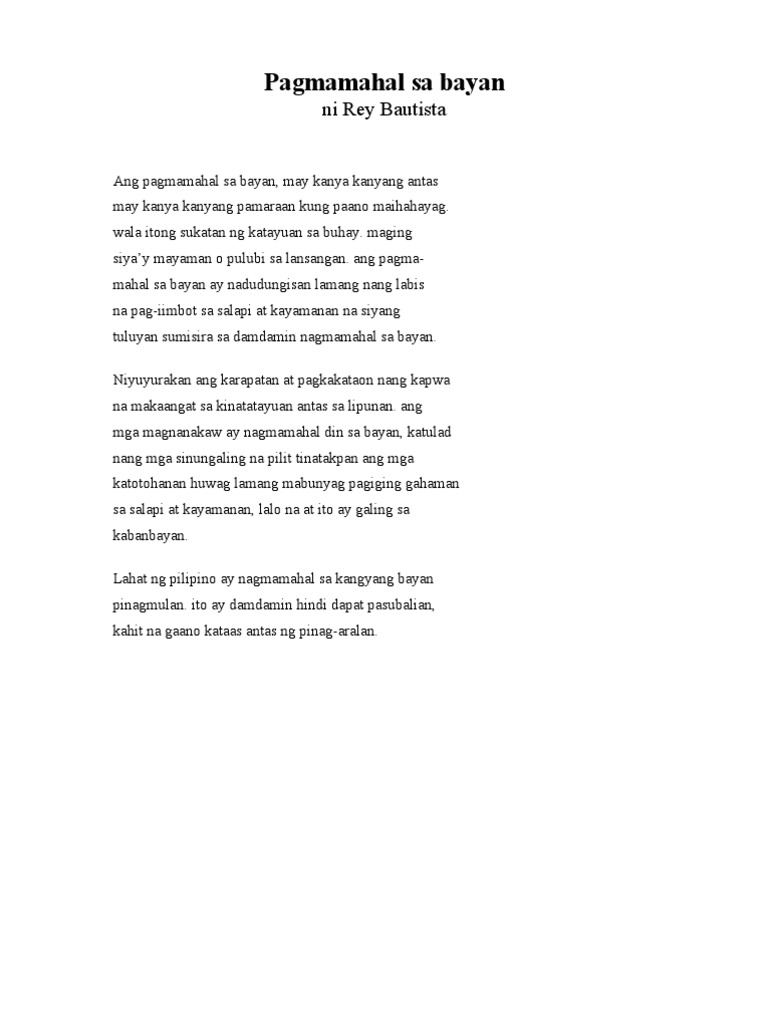 Wika natin ating mahalin pagkat tayoy Pilipino din. Par In YaTekstong Impormatibo Tungkol Sa Pamilya. Ang pagiging makabayan o pagmamahal sa bayan ay ang pagiging deboto at paglilingkod para sa kabutihan ng nakakarami na nakatira dito.